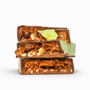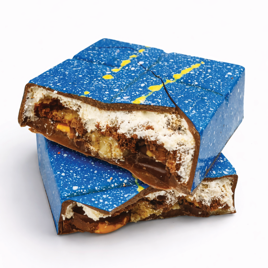 Creamy milk chocolate layered with crunchy pretzels, gooey marshmallow, and rich brownie pieces — a bold mix of sweet, salty, and indulgent textures.