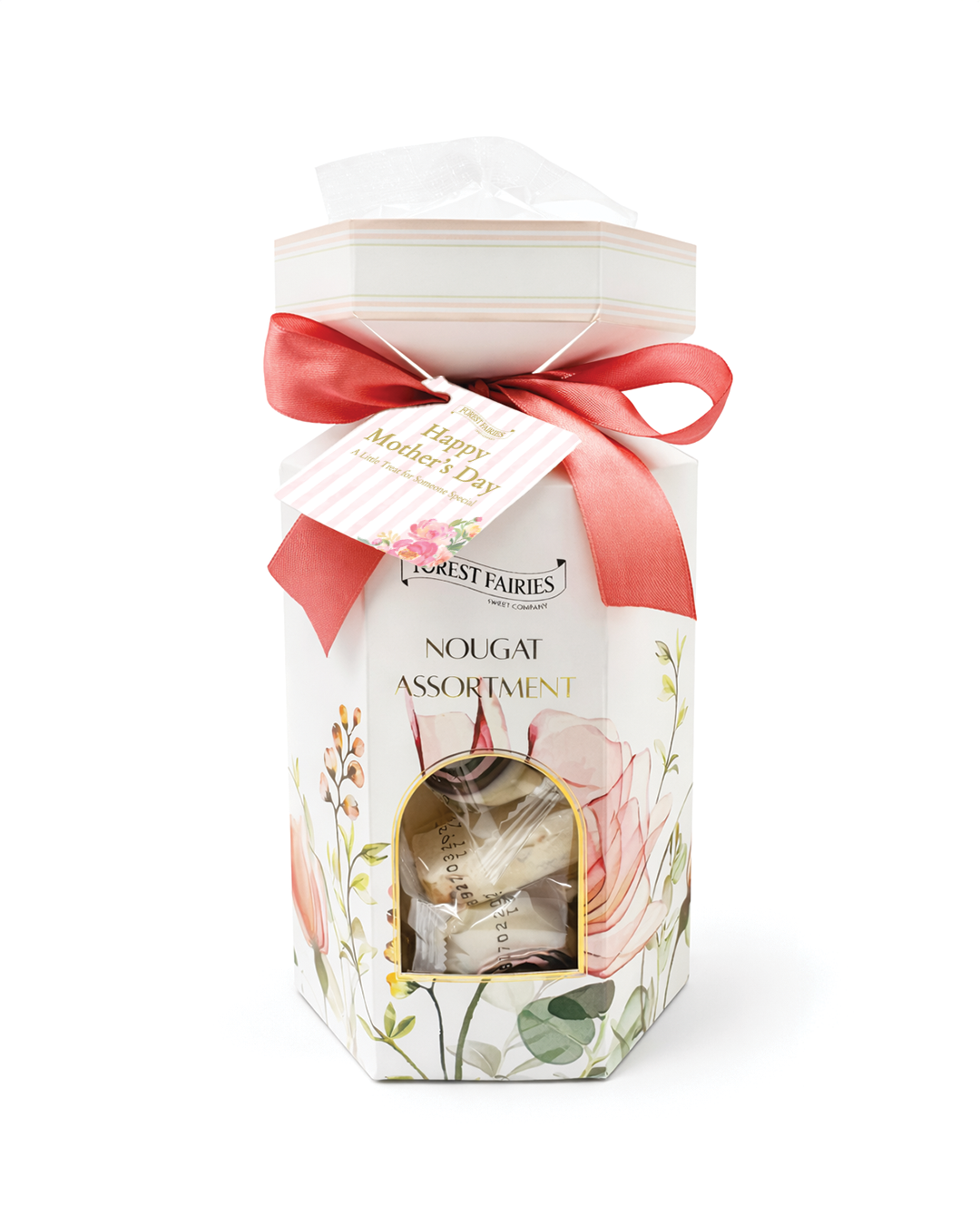 A beautifully presented 250g assortment of Forest Fairies nougat bon bons and pinwheels, specially curated for Mother’s Day. Filled with a delicious variety of soft nougat, creamy chocolate, and delicate swirls, this elegant gift is the perfect little spoil for someone special.
